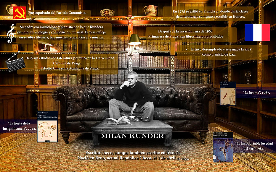 Milan Kundera nació en Brno, actual República Checa. Su padre fue musicólogo y pianista por lo que le transmitió un especial gusto por la música al joven Kundera. Estudió Cine y dio clases. Debido a la invasión rusa de 1968 perdió su trabajo como profesor y tuvo que dedicarse a ser pianista de jazz por un tiempo. También en esta época sus libros fueron prohibidos y llevaba una relación tensa con el partido comunista del cual fue expulsado, estos eventos lo orillaron a emigrar a Francia, donde comenzó a escribir en francés.